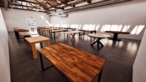 Im digitalen Showroom steuern Sie mit der Maus Ihren Blick und mit den Tasten W, A, S und D Ihre Bewegung im Raum. So können Sie frei zwischen den Tischen hindurchgehen und sich alle Produkte aus der Nähe ansehen.
